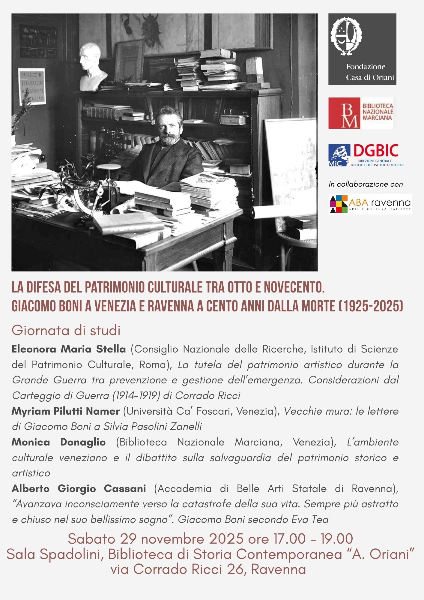 Titolo del Convegno: La difesa del patrimonio culturale tra Otto e Novecento. Giacomo Boni a Venezia e Ravenna a cento anni dalla morte (1925-2025)