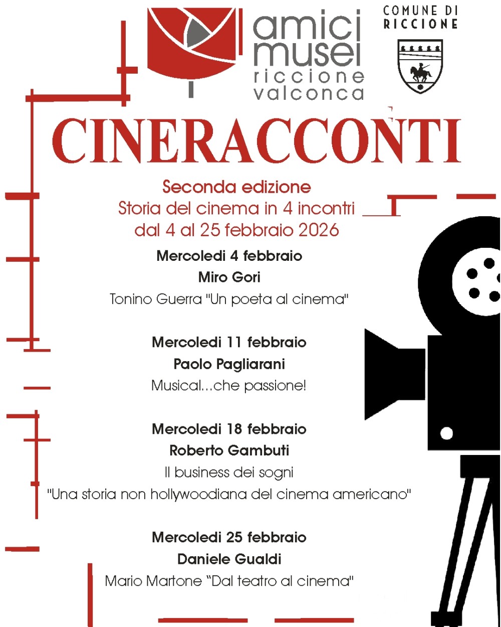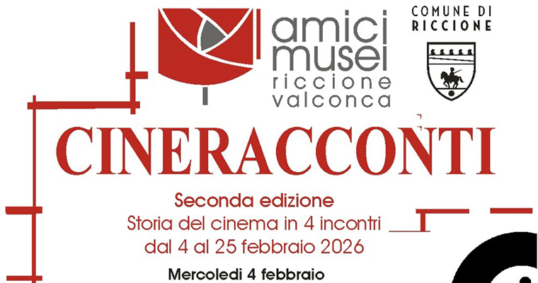 Nel mese di febbraio torna “Cineracconti”, la rassegna dedicata alla storia del cinema promossa dall’associazione Amici dei Musei di Riccione e Valconca. Un ciclo di incontri che propone un viaggio nella settima arte attraverso racconti, aneddoti e curiosità, arricchiti dalla proiezione di immagini e dal contributo di esperti del settore.