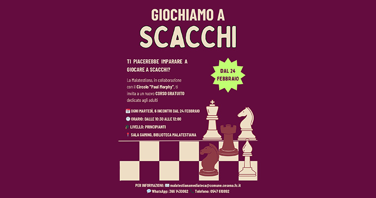 Dal 24 febbraio 2026 la Biblioteca Malatestiana di Cesena ospita un corso gratuito di scacchi per adulti, organizzato dal Circolo Scacchistico ‘Paul Morphy’ in collaborazione con la biblioteca.